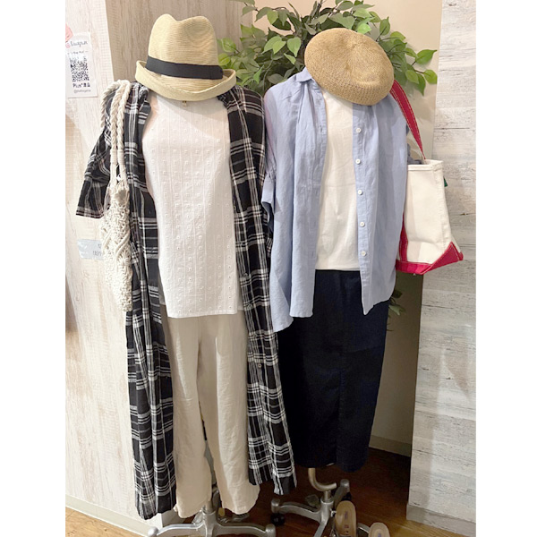 コーデ左/シャツワンピース:Basket・ プルオーバー:Basket・ パンツ:Basket