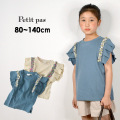 | 小花柄のフリルがアクセントのPetit pas のTシャツ♪ バックのちっちゃなリボンもかわいい! 何にでも合わせやすい無地でありながら、袖にフレアタックが たっぷりな女の子らしい一枚◎ ※80・90cmはショルダーフック付 |