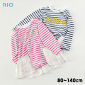腰周りのフリルがキュートなボーダーカットソー☆ 合わせるボトムとのレイヤードを楽しめる一枚です。 アクセントに加えたロゴもポイント!! |